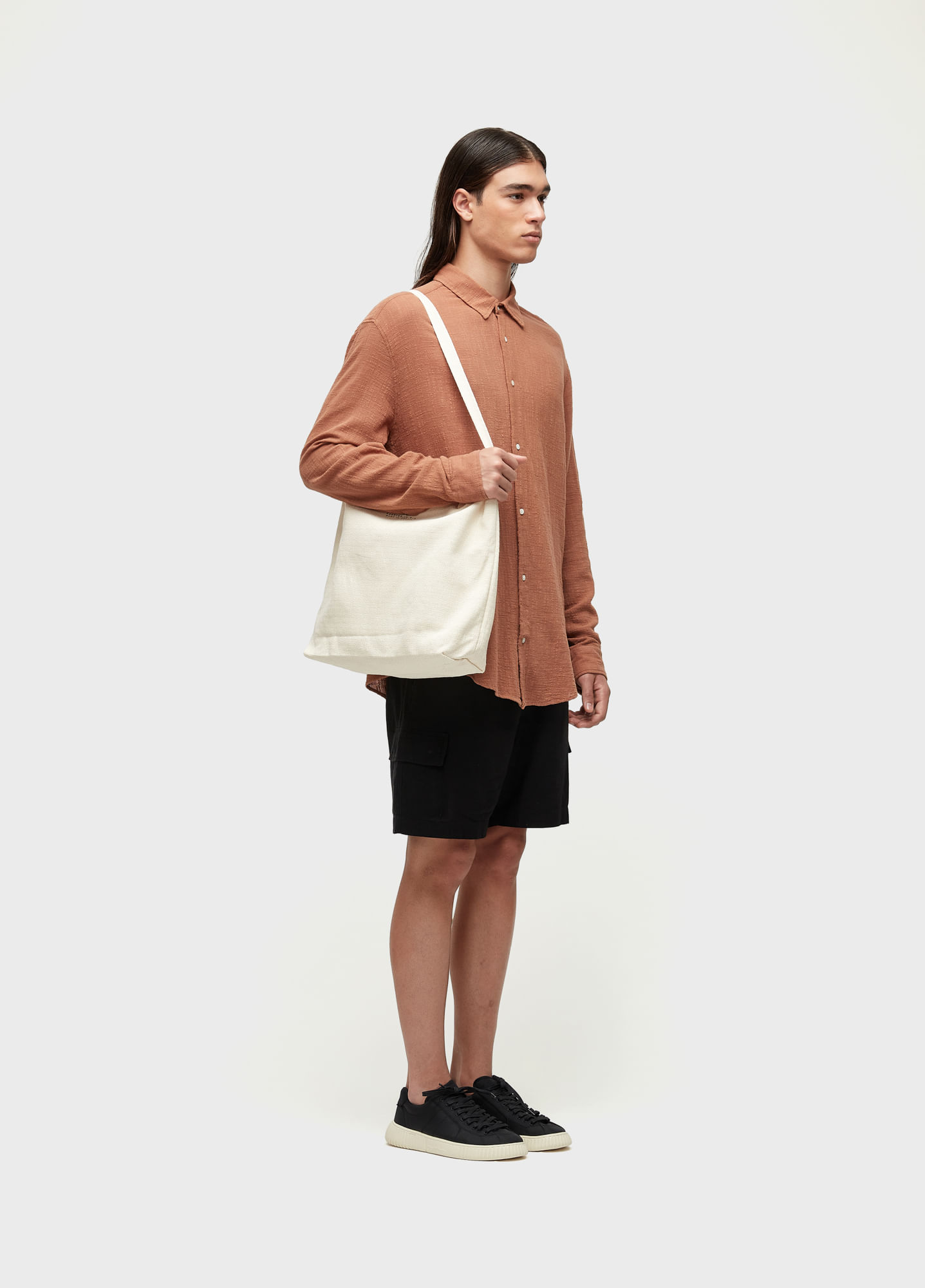 Long-sleeved shirt with wide, elongated design, made from textured cotton.