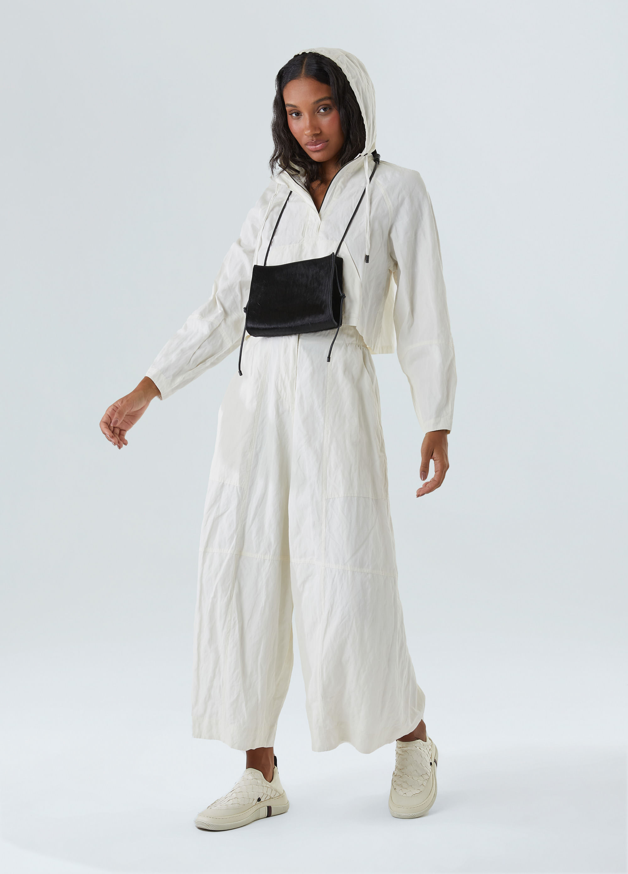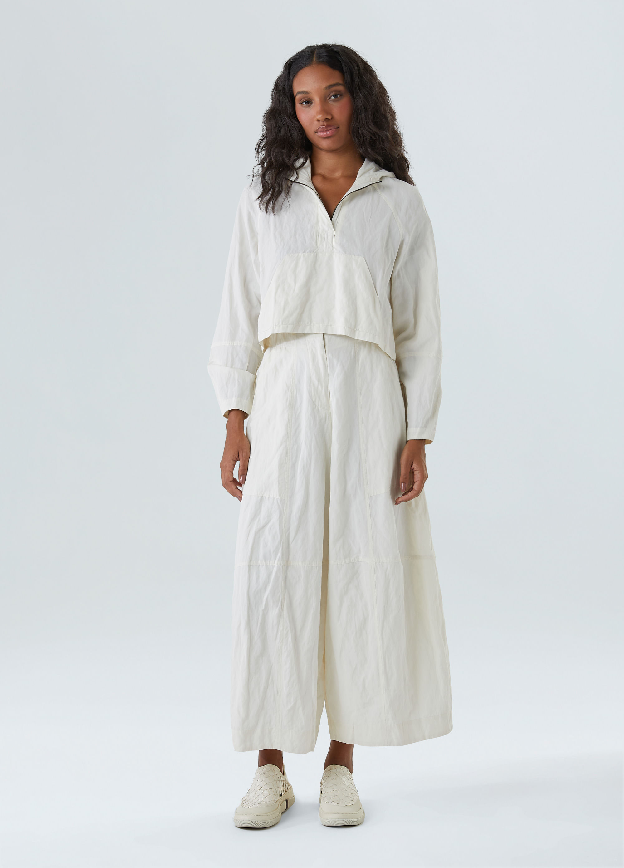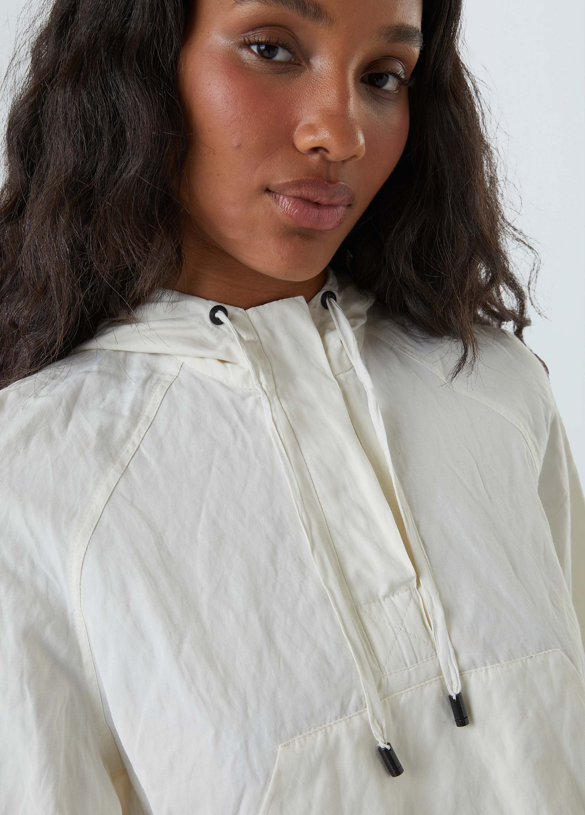 Pullover style jacket with front pocket and hood. Made from a viscose and cotton blend fabric.