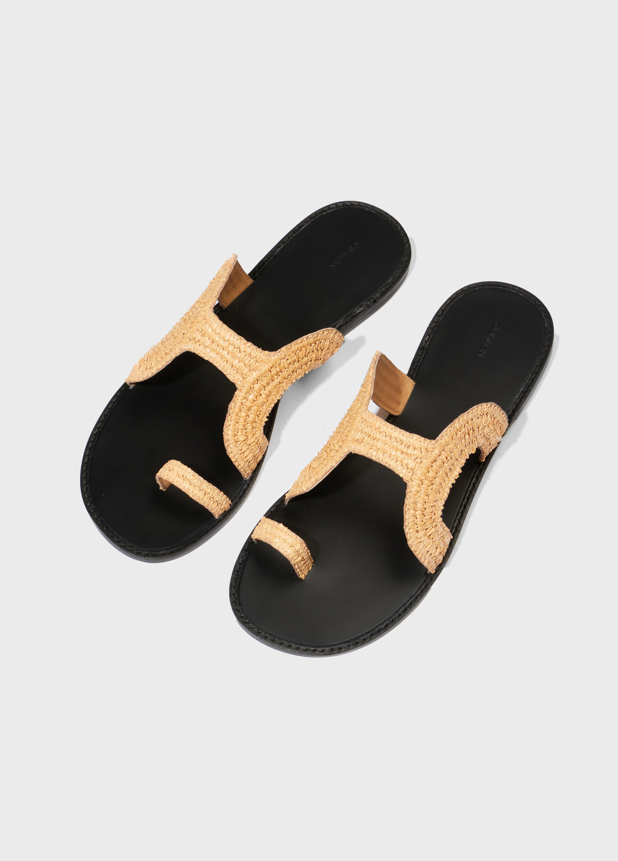 Flat sandal with bovine leather insole and raffia upper inspired by the Ipanema boardwalk. Bovine leather lining and rubber sole.